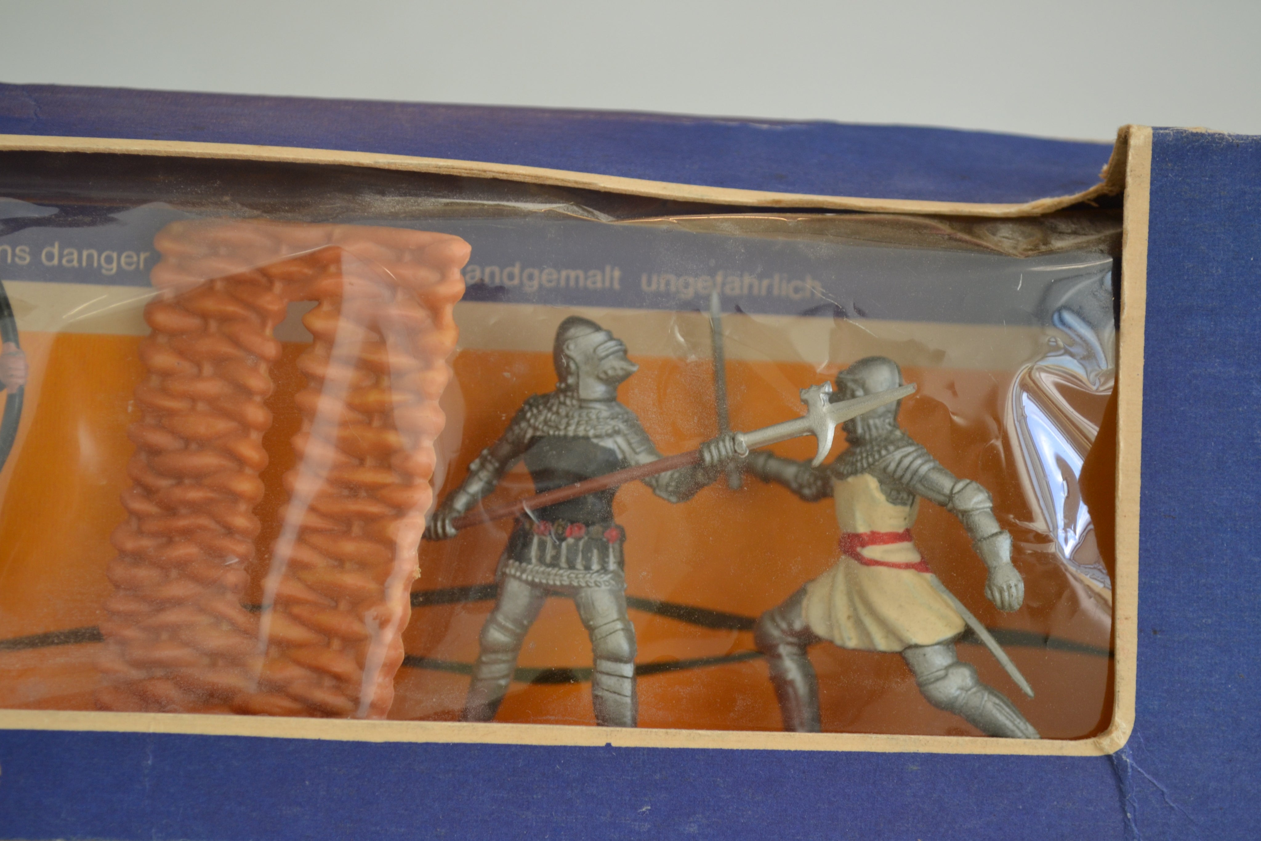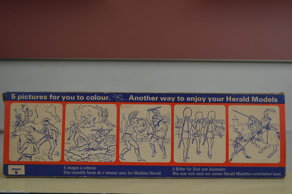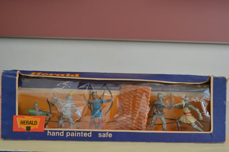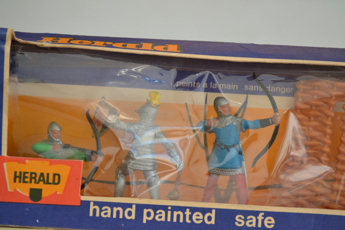 Boxed set of knights from the Herald range. Figures in good condition, box has wear and tear with small damage to perspex but generally fair. Quite a rare item.