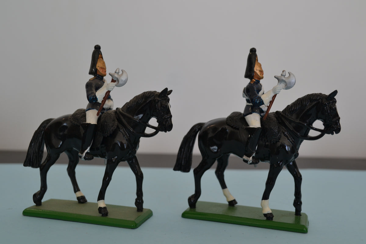 Two stunning mounted Blues and Royals from Britains ceremonial range in good condition with odd paint flicks. Both carrying farrier axes.