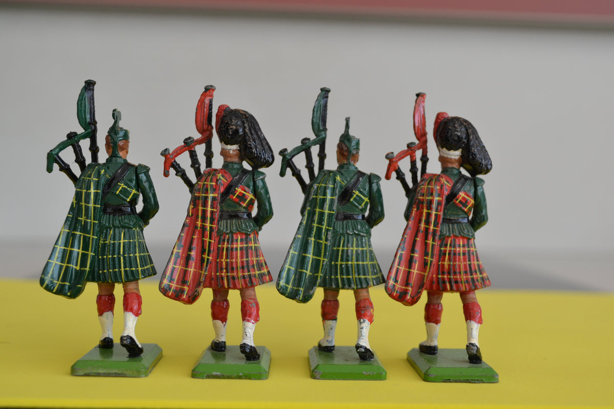 Four superb Britains metal Highland pipers, two from the Scots Guards and two from the Gordon Highlanders. Good condition