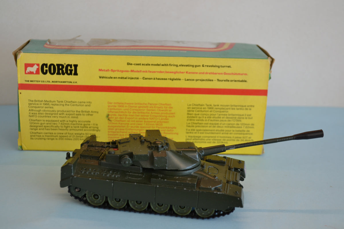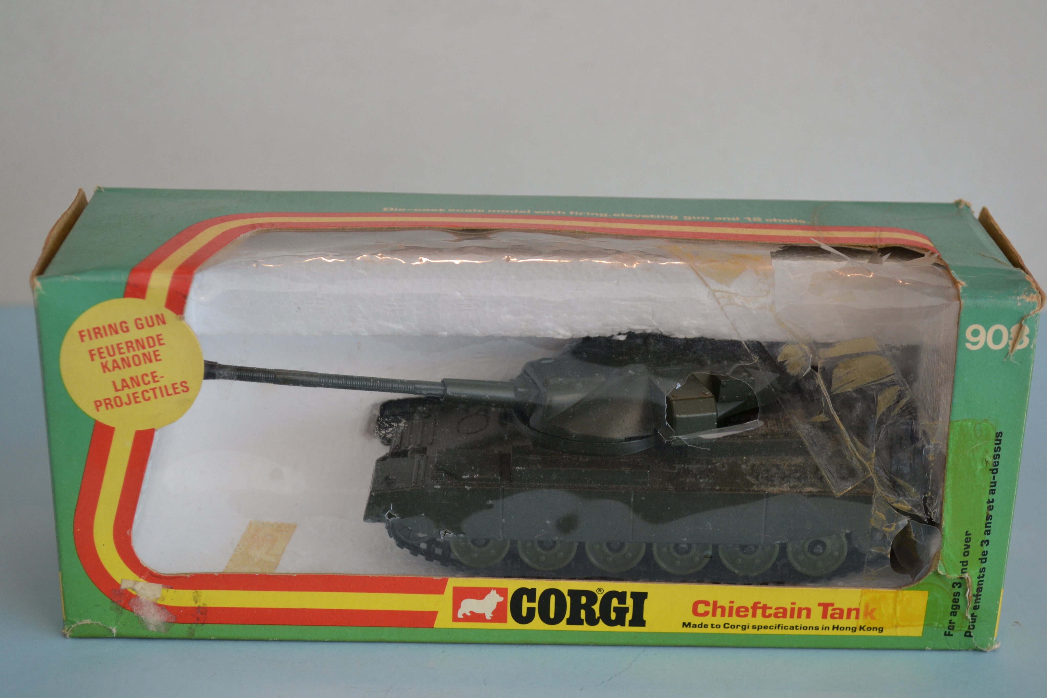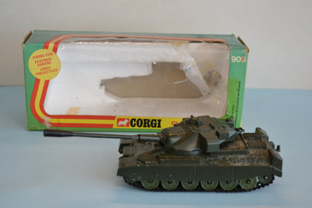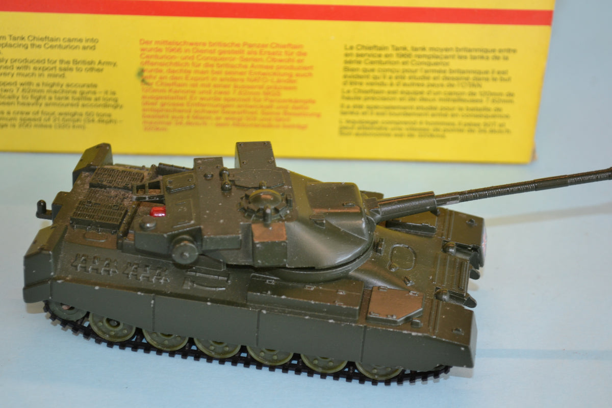 Very nice example of the Corgi 903 Chieftain tank. Tank is in fair condition, box poor to fair with wear, stains and damage to perspex (see pics). Shells missing.