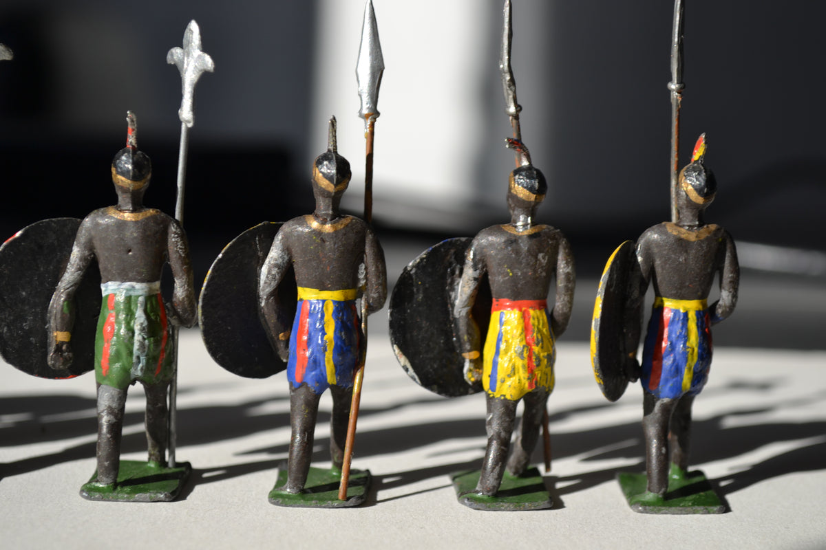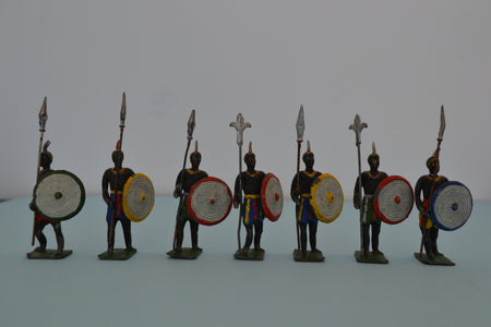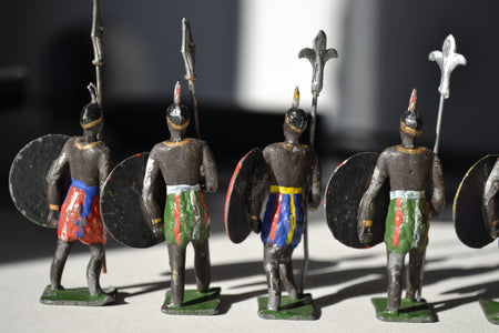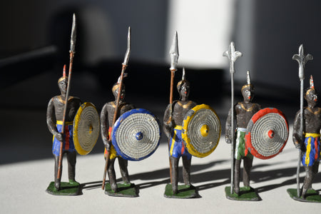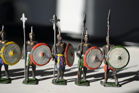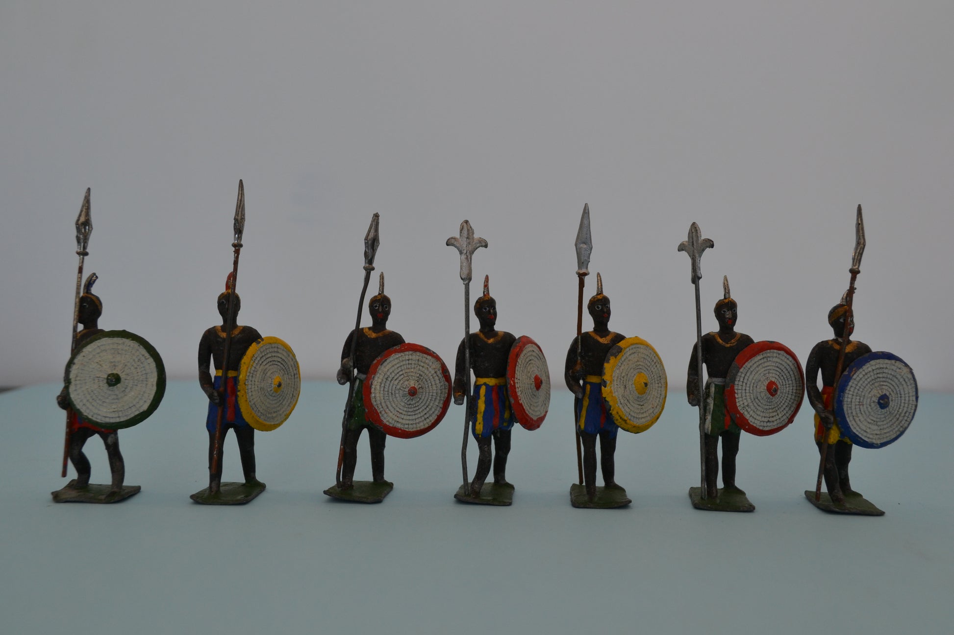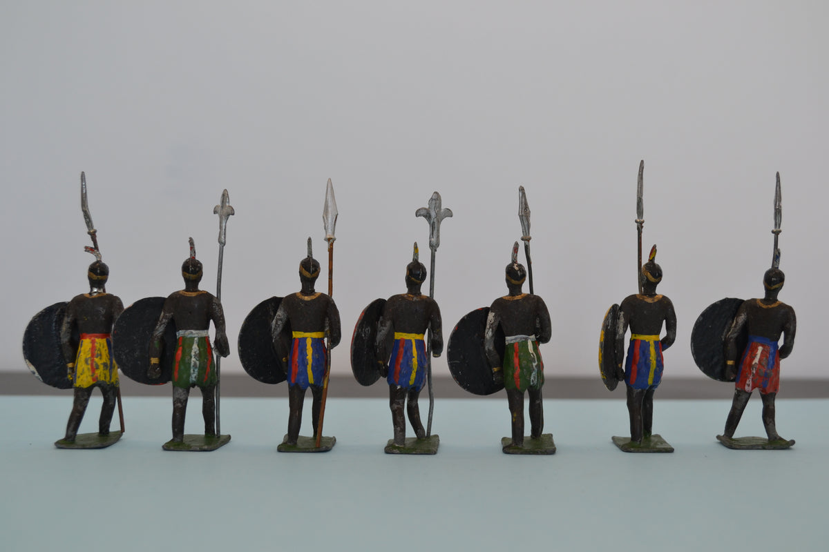 Very interesting set of 7 lead African warriors, by Georg Heyde of Dresden Germany, made around the turn of the 20th Century. Scale is approx 43mm. Condition is fairly good for age, with two alternative spears probably added from another set. Very rare and hard to find.