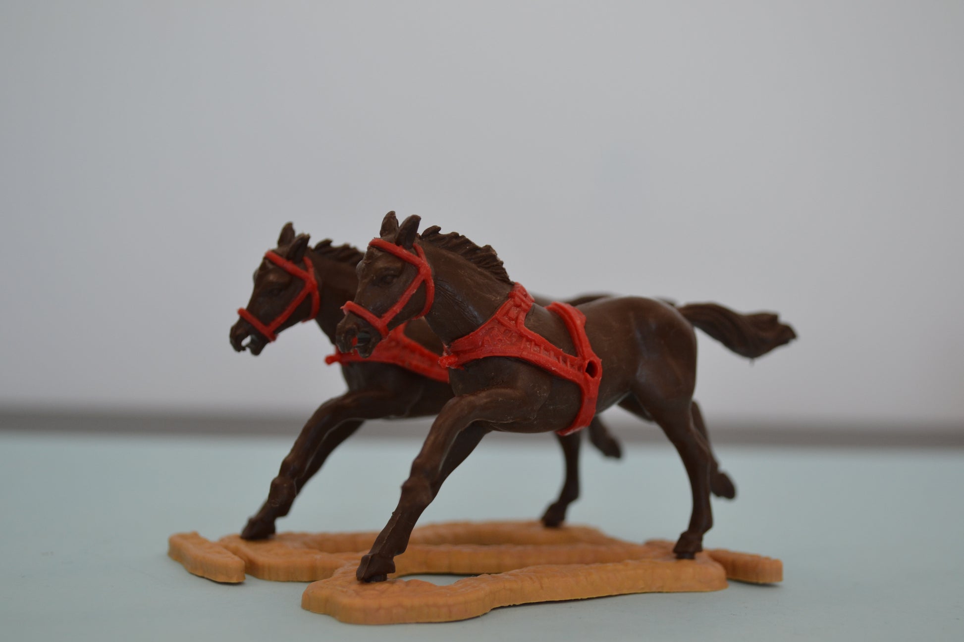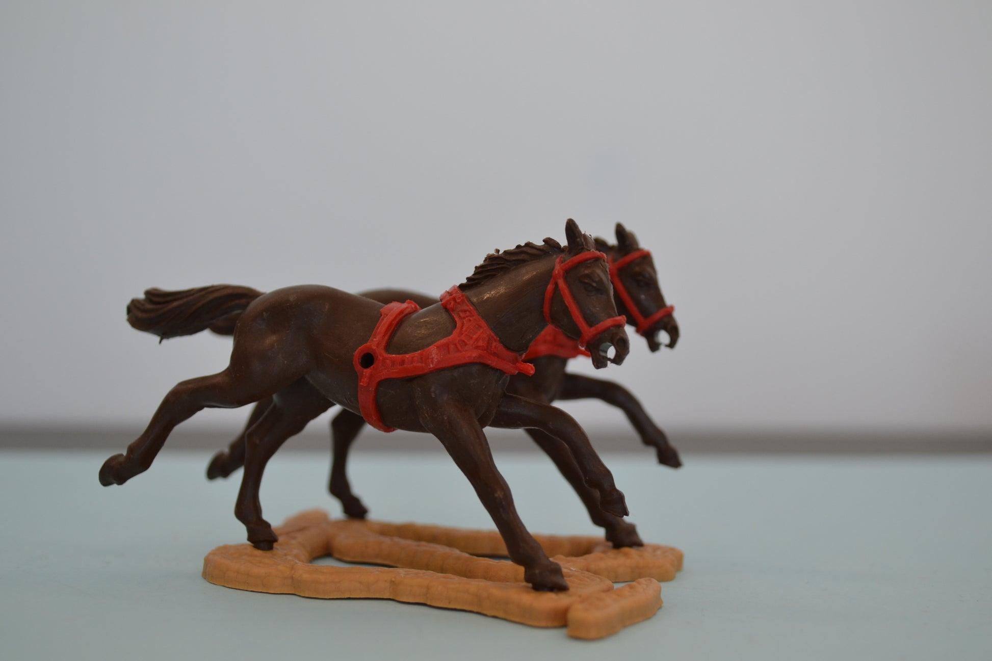 Timpo pair of coach horses, brown with red reins. Good condition.