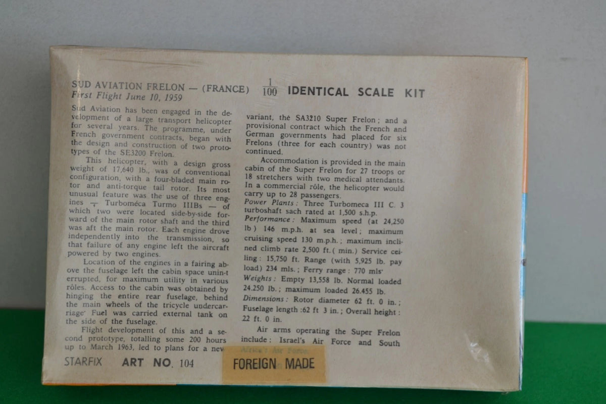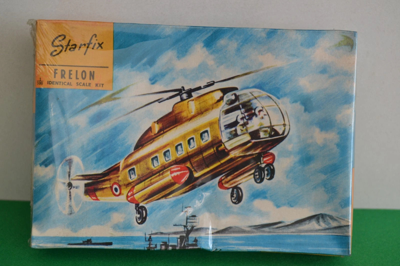 Rare vintage 1:100 kit (no.104) from Israeli manufacturers Starfix from the 60s/70s.... comprising of the Frelon helicopter. Box has some fantastic artwork.